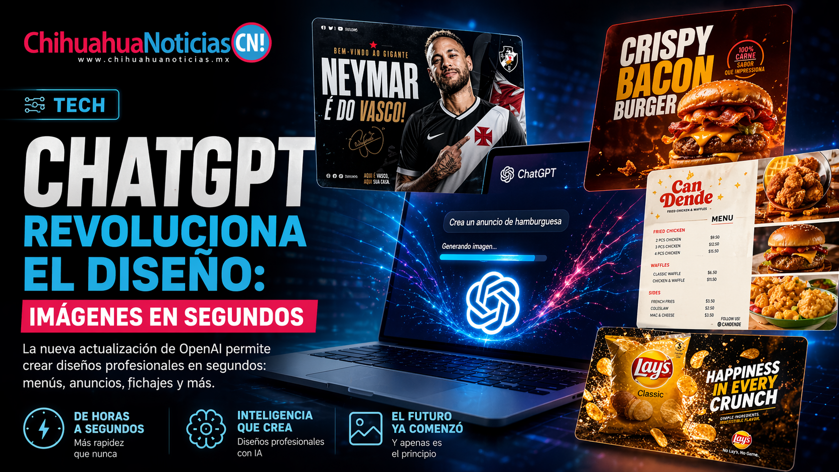 La herramienta permite generar imágenes complejas con solo describir lo que se necesita. Un menú elegante, un anuncio de hamburguesa con calidad publicitaria o incluso la gráfica de un fichaje deportivo pueden crearse en instantes.