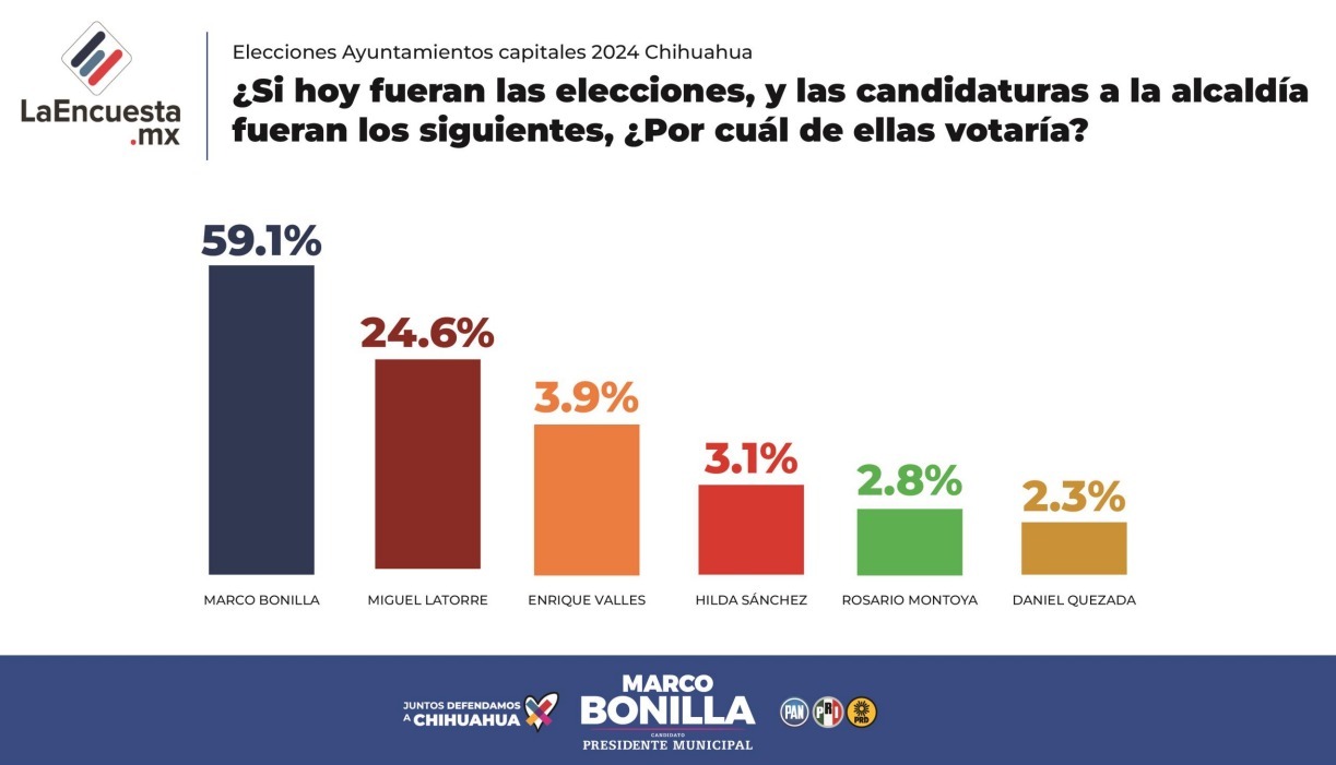 El candidato a presidente municipal por la coalición “Juntos Defendamos a Chihuahua”, Marco Bonilla, compartió los resultados de varias casas encuestadoras como La Encuesta MX, RUBRUM y Massive Caller, donde se puede observar la ventaja que mantiene en las preferencias electorales de la ciudadanía, que le brindan una amplia oportunidad de llevarse la victoria en las urnas este 2 de junio.